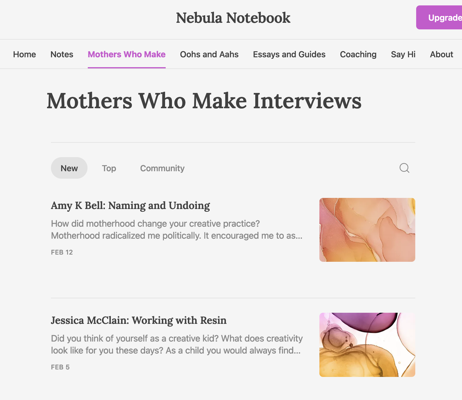 Heidi Fiedler, creator of Nebula Notebook on Substack and a writer/editor/mother herself, interviewed me as part of her “Mothers Who Make” series about parent artists. I really enjoyed gathering my thoughts on these questions, which have been on my mind and in the foreground of my creative practice for more than eight years now.
